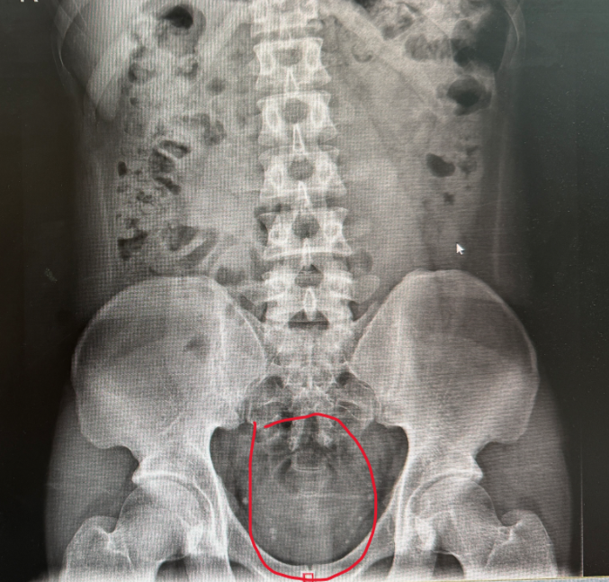 急诊科医生在指诊时发现,确有一明显异物藏于刚哥肛门内,但由于异物已被肛门“吞没”,肉眼无法观察到其形状和大小。为方便后续治疗,急诊医生立马给刚哥安排上了DR(X光)。