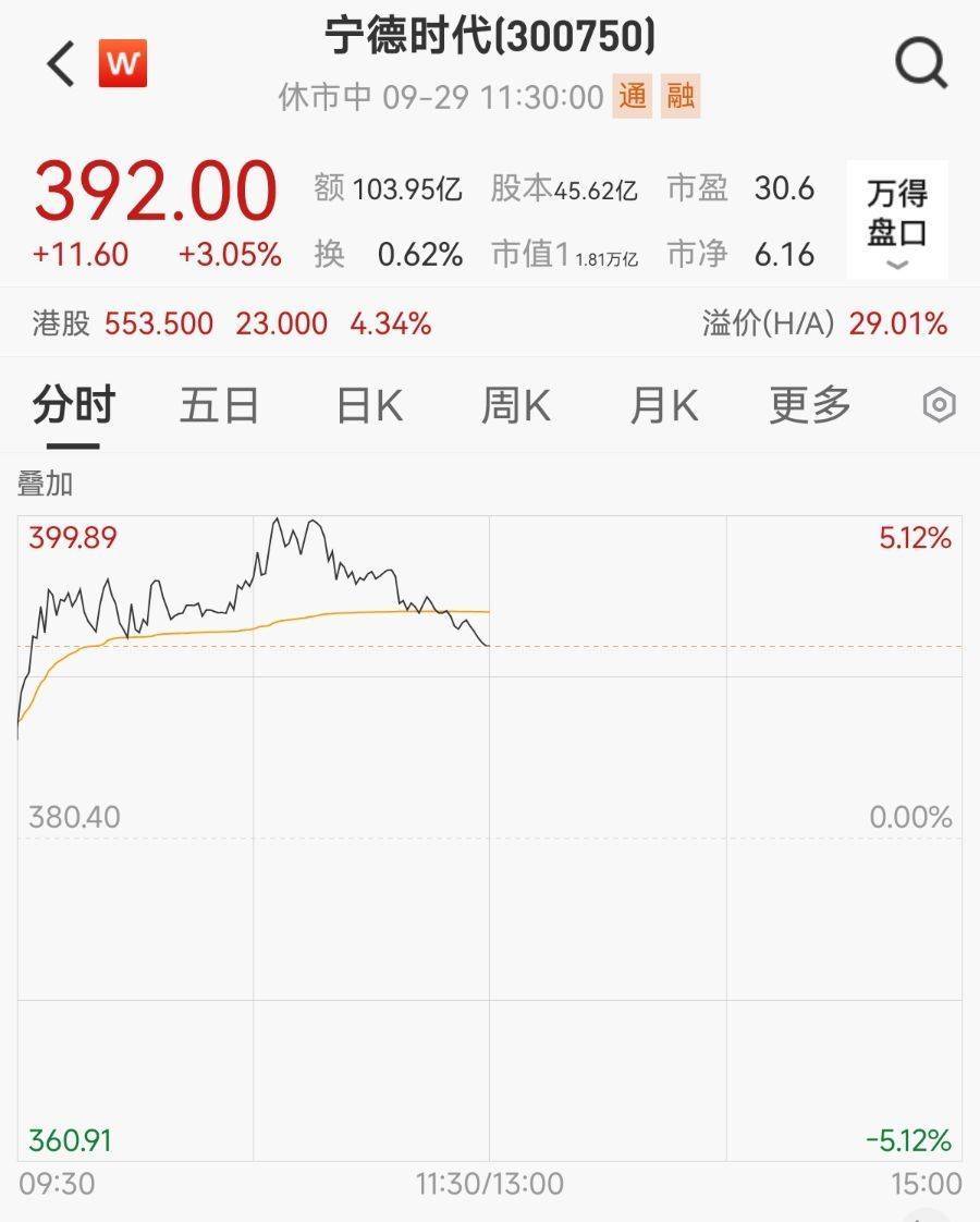 9月29日专业配资股票,锂电龙头宁德时代AH股齐涨,盘中一度涨超5%。截至午间收盘,A股宁德时代(300750.SZ)涨超3%,报392元/股,成交额103.95亿元,已超上一日全天。H股宁德时代(3750.HK)涨4.43%,报554港元/股。