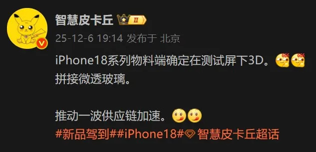 据博主@智慧皮卡丘的爆料,苹果正在测试通过微透玻璃拼接工艺为iPhone 18 Pro系列引入屏下Face ID。