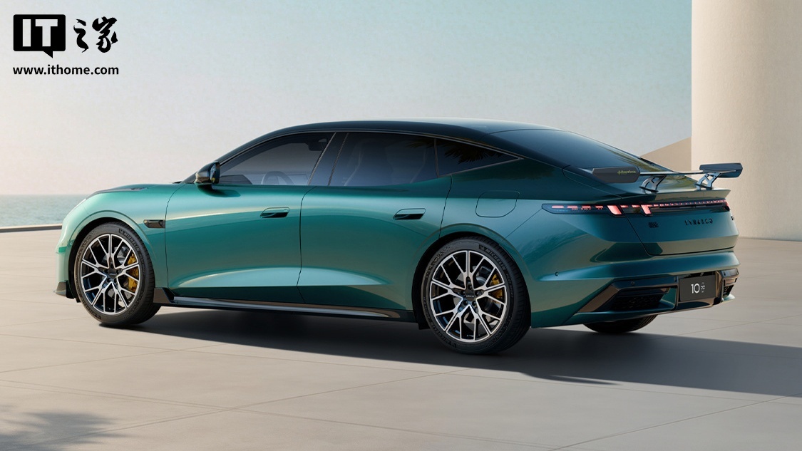 领克 10+ 基于 900V 高压架构打造,拥有专属“赛影蓝”配色,搭载前后双电机组成的智能四驱系统,综合功率高达 680kW(925 马力),可选可调碳纤维大尾翼、黄色高性能四活塞定钳、21 英寸凌风锻造轮毂等全新性能套件。